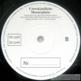 Testpressung mit Musterlabel. Auf dem Innersleeve ist neben der handgeschriebenen Katalognummer + Matrixangabe, ein roter Stempel: "Musterschallplatte - Bitte vor Preßfreigabe auch Richtigkeit der Gravur (Bestell-Nr., Seitenbezeichnung) sowie Titelfolge prüfen." zu finden. Diese Testpressung hat die Matrix des späteren Releases. Hergestellt von der